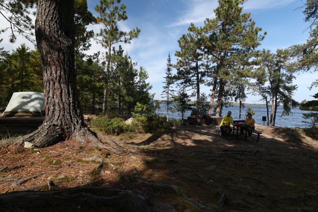 Arrived around 3pm at Woodenfrog – a rustic state campground (no running water or electricity) on Lake Kabetogama. This place operates unlike any campground we’ve visited – you buy your permit online, then choose any open site when you arrive. Our first choices (34-41) were taken, so we settled on site 4 with lots of trees near the small pier for kayak launching close by. In hindsight, maybe too many trees – they blocked our solar panels from charging our battery! We’re conserving energy to keep the fridge running.