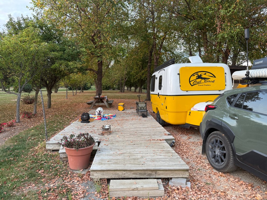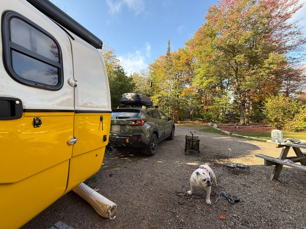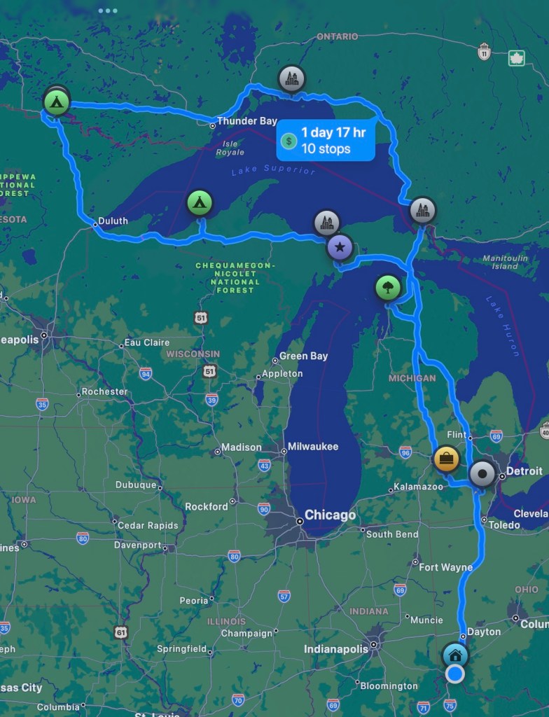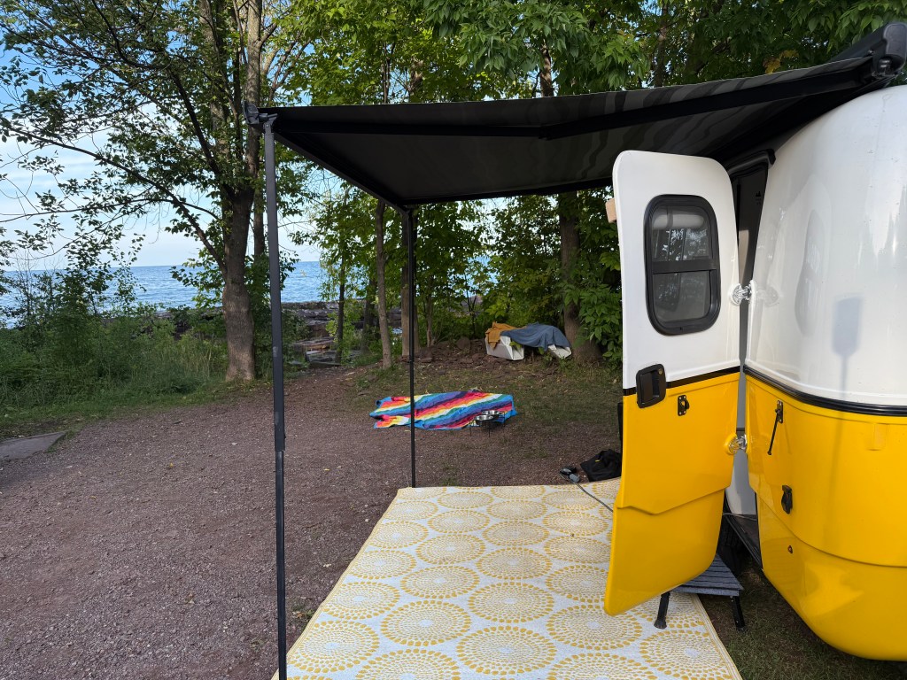 The journey continued through gorgeous lakes and forests transitioning from mostly conifers to mixed trees showing beautiful fall colors. We described them as “countless lakes” in the moment, but thinking back on our ~930 km drive, we probably saw somewhere around 200+ lakes visible from the road – no wonder Ontario is called the land of lakes! Finally arrived at Sault Ste. Marie KOA – our first KOA experience! Excellent facilities, WiFi, and close enough to town for DoorDash delivery. Sometimes convenience camping hits the spot.