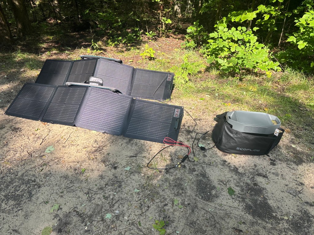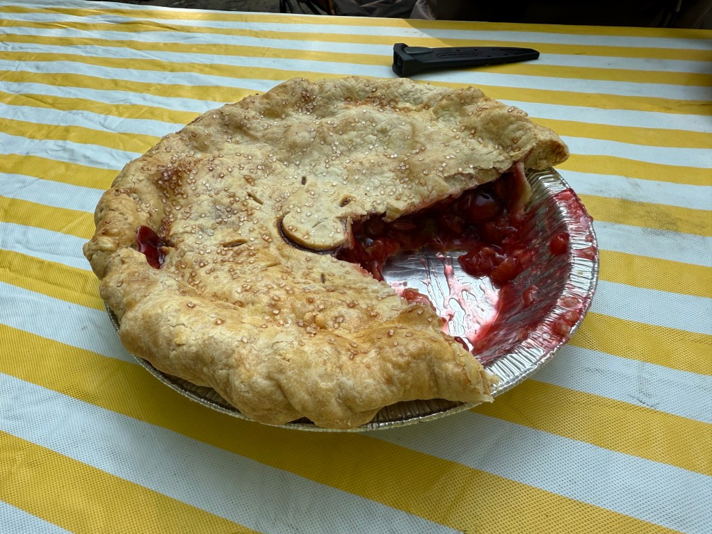 In the afternoon, we had a relaxed time in the town of Charlevoix where we had lunch at Bridge Street Taproom and a cortado at Hardwood Gold Store and Cafe. We also visited some local shops and went to take a shower at the Community Pool. On the way back to the campground, we stopped at Friske’s Farm Market to get our fix of Michigan cherry pie, which has been our dessert on several dinners since. We spent the evening at the beach, recharging our portable solar battery (our campsite had lots of tree coverage, which is nice, but blocked direct sunlight) and relaxing. We prepared dinner on the campfire. A perfect day!