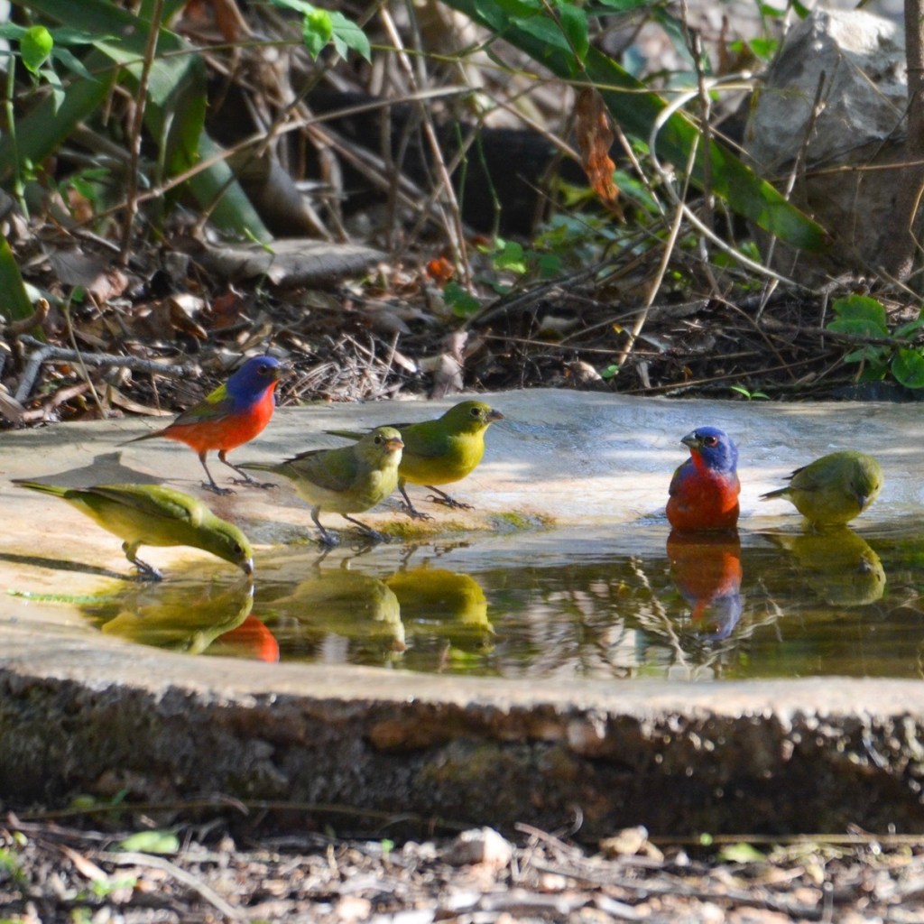 The birdbath did not disappoint while we waited. A Rose-throated Becard (Pachyramphus aglaiae) appeared in the tangle of branches nearby — a compact, striking bird with a dark cap and that distinctive flash of rose-pink at the throat. Then the Painted Buntings (Passerina ciris) arrived, and kept arriving. At one point there were at least two adult males and several females and immatures all drinking and bathing simultaneously, their reflections doubling the spectacle in the still water. The adult male Painted Bunting is one of the most extravagantly colored birds in North America — blue head, red underparts, green back — and seeing multiple individuals together at close range in good light is the kind of moment that reminds you why you set the alarm for 5 am. A pair of Golden-fronted Woodpeckers (Melanerpes aurifrons) worked the nearby trees, and Hooded Warblers (Setophaga citrina) and Melodious Blackbirds (Dives dives) rounded out the station list.