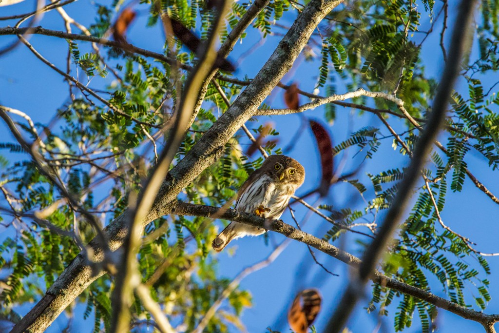 We started on one of the forest trails as the early light began filtering through the canopy. Ramón pointed to the top of a tree almost immediately: a Ferruginous Pygmy-Owl (Glaucidium brasilianum), catching the first warm rays of the morning sun. It was Ramón who had first spotted this species for me during the tour with Luis, and here he was doing it again — a reminder that his ability to find birds is not accidental. He and his brother share an intuitive understanding of bird habits and habitat that goes well beyond simply knowing where species occur. They anticipate the situation and put you in position before the bird even shows itself.